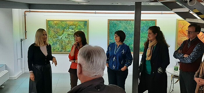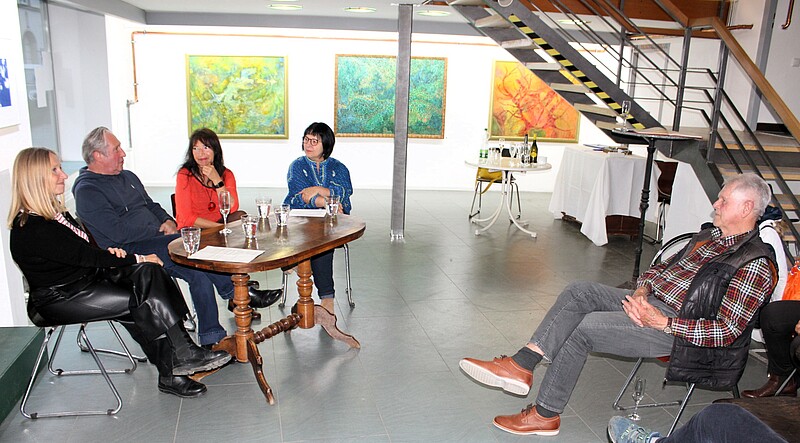 Ute Schaeberle forderte die Gäste zunächst auf, sich zwei ausgesuchte Arbeiten der Künstler zu widmen. In einer visuellen Bilderreise sollten sie sich auf einen Blaudruck von Franz Ramgraber und einem großformatigen abstrakten Ölbild der Künstlerin Christine Etschel emotional einlassen, sprich Gefühle spüren, die Augen schließen, durchatmen, zu sich kommen und dann Farben und Formen wirken lassen - jeder für sich im Stillen. Es geht dabei nicht um intellektuelle Interpretationen, sondern sich Zeit für Kunst zu nehmen und die Sprache des Künstlers zu verstehen. Kurz darauf eröffnete Moderatorin Andrea Weber die Gesprächsrunde und erfuhr von den unterschiedlichen Herangehensweisen der beiden Künstler. So verriet Christina Etschel, dass sie mit ihrer Mischtechnik gerne verschiedene Schichten aus Öl, Acryl und Schlagmetall anlegt. „Ich mag es aufwendig, stimmungsvoll und beweglich – so wie die Natur eben auch ist“, erklärte sie. Die Blaudrucke des pensionierten Chemiefacharbeiters und Fotografen Ramgraber aus Burghausen riefen zumindest bei einem Besucher Erinnerungen an seine Kindheit wach. Trotz abstrakter Linienführung entdeckte er auf einem Bild die Form einer Pusteblume.