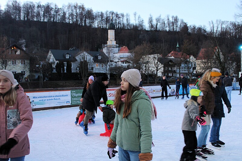 Wolfratshausen, 3.12.2025 – Bei idealem sonnigen Wetter und ausreichend kühlen Temperaturen stürmten am Freitagnachmittag vor allem Kinder und Jugendliche die rund 450 Quadratmeter große künstliche Eisfläche an der alten Floßlände. Bis zum 11. Januar 2026 steht sie für Schlittschuhläufer und Eisstockschützen zur Verfügung. Dank eines Außenbereichs mit Feuerschale und Bewirtung haben dort auch Zuschauer und andere Besucher ihren Spaß.