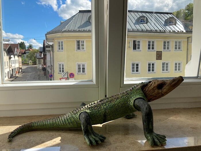 Da liegt ein Krokodil und sonnt sich auf der Kunstturm-Fensterbank, da kringelt sich ein Chamäleon um einen Ast, da sitzt ein kleiner Vogel auf einer Stele in der Galerieecke. Eines haben diese Plastiken aus Holz und Ton gemeinsam. Überwiegend sind die Köpfe der Tiere aus naturbelassenen und unbearbeiteten Holzfundstücken. Antje Schmuck findet die Holzstücke in der Natur. „Ich erkenne sofort, was es ist“, sagt die Künstlerin mit ihrem geschulten Blick. Dann aber lässt sie ihre Fundstücke erst einmal ein Jahr liegen und trocknen, ehe sie ihnen aus Ton den Körper respektive die Gesamtdarstellung formt, glasiert und brennt.