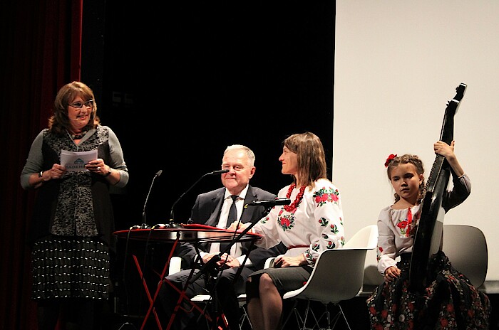 Als die Grundschülerin Lotta Fischer zur Eröffnung des Abends auf der Geige das Lied „Maikäfer flieg“ anstimmte, Seifenblasen in die Luft stiegen und Hörfunksprecher Jürgen Jung den Satz „Ukrainerland ist abgebrannt“ sang, werteten dies viele Besucher als Zeichen für (vorerst) geplatzte Friedensträume. Angesichts des straffen Programms hielt sich Badehausvorsitzende Dr. Sybille Krafft nicht mit langen historischen und politischen Betrachtungen auf, sondern überlies zunächst der Realschule Geretsried die Bühne. Die von Gabriele Rau geleitete Chorklasse interpretierte den Ukraine-Hilferuf „You raise me up“ und hielten dabei Friedenstafeln hoch. Eine Steilvorlage für die geflüchtete Lehrerin Oksana Semenova und ihre Tochter Darina: Nachdem die Mutter einen Textauszug aus dem Werk der bekannten ukrainischen Schriftstellerin Oksana Sabuschko vorgelesen hatten, spielte ihre Tochter auf der Bandura – einer ukrainischen Lautenzither – zwei Volkslieder. Das gefiel auch dem Schirmherren Dr. Wolfgang Heubisch. Der Vizepräsident des bayerischen Landtags kam auf die Bühne, um die deutsche Übersetzung eines Textes von Sabuschko zu lesen.