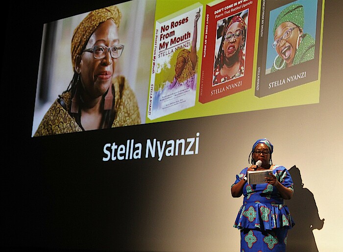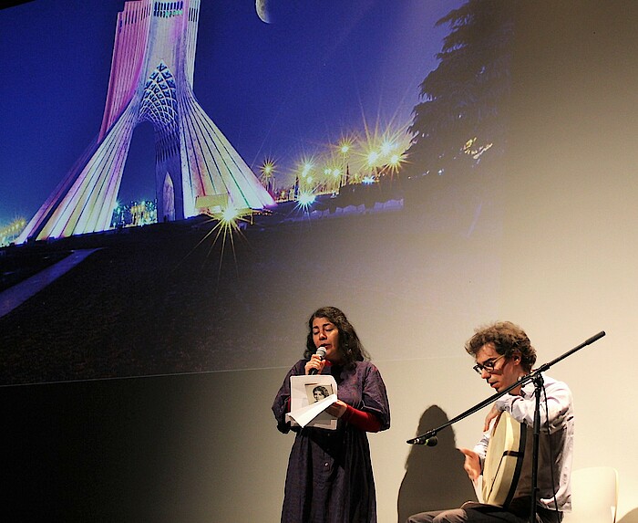 Der 2017 von Flüchtlingen in München gegründete Syrische Friedenschor leitete danach über zur Krisenregion Kurdistan. Das Schriftsteller-Ehepaar Anisa Jafari Mehr und Jihar Jahan Fard erinnerte an Flugzeugangriffe der türkischen Besatzer und vielfältige Entbehrungen. Das Schreiben von Büchern hilft ihnen dabei, das Erlebte zu verarbeiten. „Der Tod der Sprache wäre der Tod der Gefühle“, betonte Fard. Mit Bildern erregt die afghanische Fotografin Roya Heydari Aufsehen. Da keine Ausreisegenehmigung aus ihrem Exil in Paris vorlag, erklärte Badehaus-Vizevorsitzender Jonathan Coenen ihre Fotos. Es folgten kämpferische Reden der türkischen Autorin Nazli Karabiyikoglu, die 2013 die gewaltsame Neiderschlagung von Protesten im Istanbuler Gezi-Park hautnah miterlebt hatte, sowie eine Videoeinspielung der weißrussischen Schriftstellerin Volha Hapeyeva.
