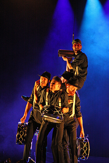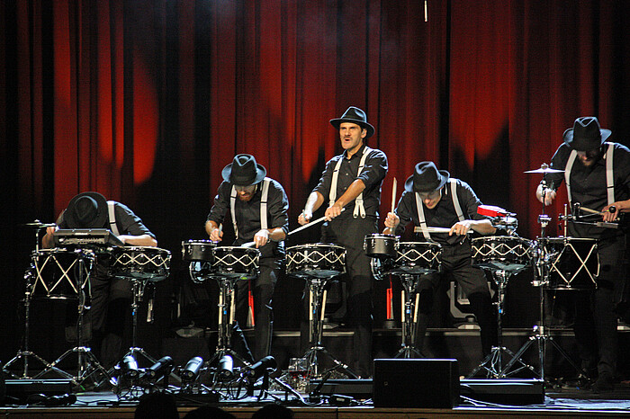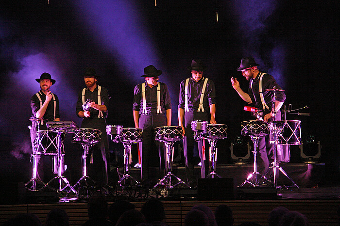 Es war dunkel, nur im Scheinwerferkegel waren Gestalten zu erkenne. Die Spannung stieg, jeden Moment könnte der Schuss losgehen. Gefährliche Stille, ein einzelner Takt, noch einer, dann ein dumpfer Knall einer Basstrommel. Und schließlich ging ein Rhythmusfeuerwerk los, dass den Publikumsgästen tief in die Magengrube fuhr. Ein Klangspektakel wie ein Kugelhagel aus der Schnellfeuerwaffe.
