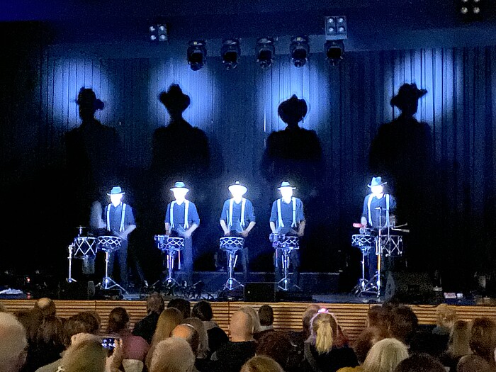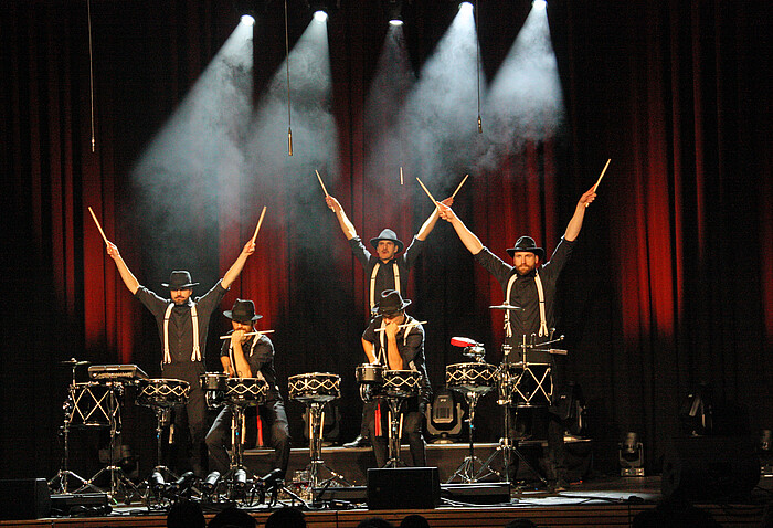 In völliger Synchronisation, mit akrobatischer Fähigkeit, ließen die fünf Schlagzeuger die Trommelsticks kreisen, wischen, klappern und klopfen. So entstand ein Klangvolumen, das sich von leise bis tobend laut, von dumpf bis schrill veränderte und die Spannung zur Inszenierung aufbaute. Es war Slapstick ohne Worte, nur mit exzellent dargestellter Pantomime und den Trommelstöcken erzählt. Von Al Capone und seinen Verbrechern, von den Pizzabäckern, die den Teig rührten und klopften. Von Polizisten, die mit den Hosenträgern schnalzten und von Boxern im Ring, die sich mit den Fäusten kloppten. Schließlich waren sie nur Marionetten am Faden, die in Perfektion die Trommelstöcke führten. Eine meisterhafte Inszenierung, voller Gestik, Mimik und Bewegung. Eine Lichtshow von den Technikern punktgenau abgestimmt. Am Ende war das absolute Highlight, wie die fünf Rhythmusmeister das gesamte Publikum zum Mitklatschen führten, so dass im Saal der Loisachhalle ein rhythmusgewaltiges Trommelfeuer entstand.