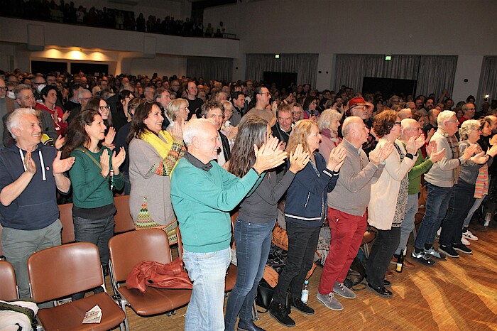 Dem fortschreitenden Klimawandel widmeten die Well-Brüder das bitterböse Musikstück „Alpinisimo tropical“. Weil der Schnee in den Skigebieten ausfalle, werde der Tourismus dort nun wie am Ballermann auf Mallorca in „Los Wochos“ umgestaltet. Kurz darauf garnierten die Musiker die Stücke der Comedian Harmonists mit zeitkritisch-ironischen Texten. Dem „Wochenend und Sonnenschein im Altersheim“ folgte „Schwester Veronika, der Arzt ist da“. Lokalpolitische Themen wurden schließlich in einer Tirade von Gstanzln genüsslich persifliert. Nach einer Abrechnung mit der sich verzögernden S-Bahn-Verlängerung nach Geretsried kam die Empfehlung, den Wolfratshauser Marienbrunnen doch einfach in die Loisach zu werfen. „Das könnt‘ a schöne Surfwelle geben“, glauben die Well-Brüder. Am Ende des fast dreistündigen Auftritts entledigte sich Gerhard Polt seiner Jacke und intonierte wie ein Rockstar den afrikanischen Gassenhauer „E-Mam-Be-Le“. Die rund 700 Besucher in der ausverkauften Loisachhalle hatten sich zu diesem Zeitpunkt längst von ihren Stühlen erhoben und applaudierten zudem den famos aufspielenden Well-Brüdern.