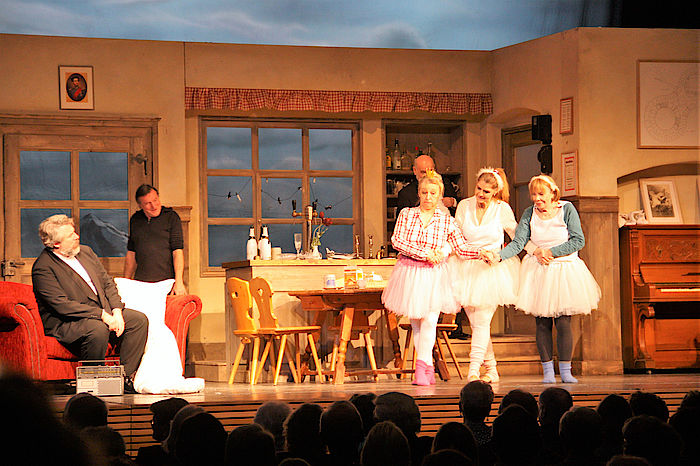 Der Komödienstadel ist ein Original. Für gewöhnlich werden die Bühnenstücke in bayerischer Mundart für das Fernsehen vor Publikum im Theatersaal aufgezeichnet. Kameras waren dieses Mal nicht dabei, dafür viele begeisterte Stadl-Fans, die bei dem aktuellen Stück „Göttinnen in weißblau“ auf ihre Kosten kamen. Es wurde herrlich gelacht, und dass nicht nur wegen der Originalität der Schauspieler. In dem Bühnenstück in drei Akten von Cornelia Willinger ging es recht turbulent zu und es gab immer wieder komödiantische Überraschungen von höchstem Unterhaltungswert. Der Spaß gipfelte beim urig-grotesken Männerballett. Einfach köstlich, wie die brustbehaarten Herren im Schwanenkostüm über die Bühne tänzelten.