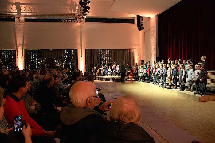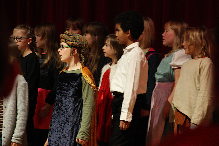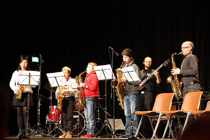 Die Kinderchorgruppe I und II von Yoshihisa Kinoshita und Emanuel Schmidt präsentierten das Chiemgauer „Klöpflliad“ in der Klöpflszene. Kompliment, wie die Kinder im Grund- und Vorschulalter fröhlich gesungen und die Dialoge frei gesprochen haben. Anschließend saßen sie brav am Boden bis zur nächsten Szene. Erst als die Bigband unter Leitung von Andreas Unterreiner mit „White Christmas“ nach fast zwei Stunden zum musikalischen Endspurt ansetzte, wurde es in den Reihen der Kinder verständlicherweise unruhig. Gesamt gesehen war das diesjährige Weihnachtskonzert ein vergnüglicher, kurzweiliger und unterhaltsamer Abend aus traditionellen Weihnachtslieder, amerikanischen Christmas-Klassikern, Medleys und natürlich dem Glöckchen-klingelnden Jingle Bells, mit allen Chören und den verschiedenen Ensembles. Am Ende gab es Schoko-Nikoläuse zum Abschied ins neue Musikschuljahr.