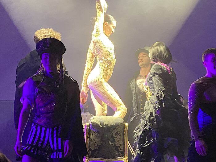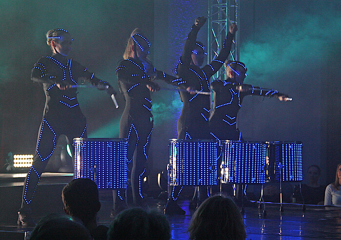 Aber nochmal zurück zum Anfang, denn auch das Intro gehört zu einer Show wie dieser. Es waberte Rauch in den blau illuminierten Lichtkegeln und riesige Lichterringe tanzten an der Saaldecke. Rhythmischer Sound puschte beim ankommenden Publikum die spannungsvolle Erwartung hoch. Man nahm stilvoll an kleinen runden Tischchen Platz, wie es in Varieté-Theatern üblich ist. Ein spektakulärer Bühnenaufbau aus vier riesigen Stahltraversen stand auf einer verlängerten Bühne inmitten des Publikumsbereichs, damit alle von allen Seiten gut sehen konnten. Eine Dame im Publikum staunte: „Wie schön, sowas wieder erleben zu können“, sagte sie freudig.