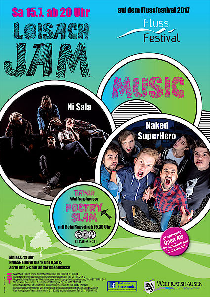 Wolfratshausen - Poetry Slam mit Live Musik von Ni Sala und Naked SuperHero. Die Erfolgsgeschichte „Wolfratshauser Poetry Slam“ geht in die nächste Runde. Bisher konnten die zwei vorherigen Slams mit jeweils ca. 100 Besuchern restlos ausverkauft werden. Diesmal ist die Hürde bei 500 Personen auf dem Flussfestival 2017 sehr viel höher angesetzt, aber dafür holen die Jungs von Reimrausch auch namhafte Slam-Poeten aus ganz Deutschland auf die Flussbühne. Unter den Teilnehmern finden sich neben Deutsche- und Landesmeistern auch ein Weltrekordhalter. Zu gewinnen gibt es neben Ruhm, Ehre und 50€ Preisgeld auch das Wolfratshauser Krautfassl auf dem sich die Sieger des Wolfratshauser Poetry Slams ab sofort verewigen dürfen.
