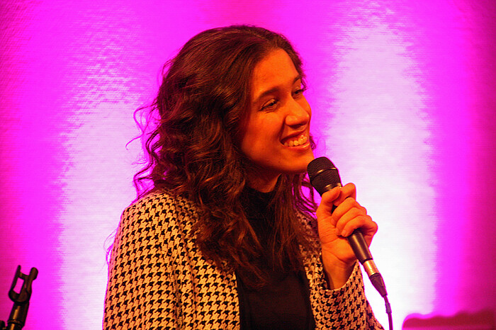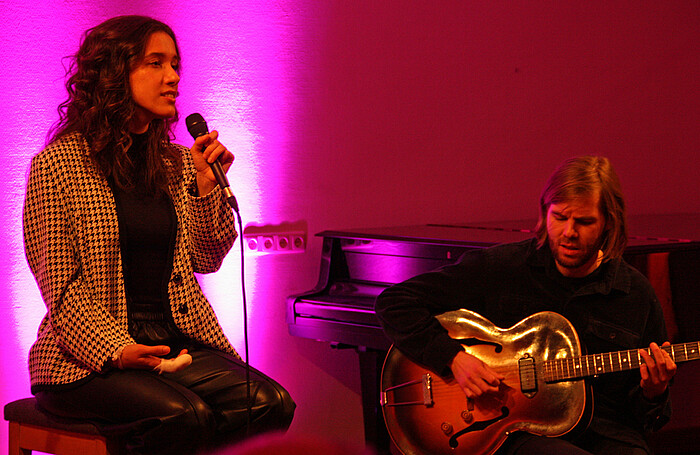 Es war ein Konzert zum Träumen. Darunter eine brasilianische Jazznummer, die Alma Naidu auf Portugiesisch sang. Ein eigenes Stück namens „Mystical“, das einer geheimnisvollen Klangstruktur folgte, und Lieblingsjazzstandards wie „The Sunny Side oft the Street“ und das berühmte „Caravan“ von Duke Ellington, das an den Klang der Wüste denken lässt. Eine Musik, die das Publikum in den Bann zog. Eine Musik aus purem Gesang und feinem Gitarrenklang – minimal und wunderschön.