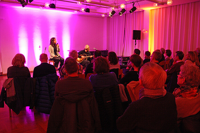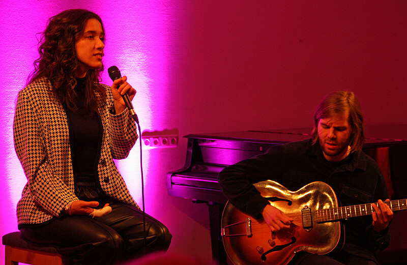 Es war ein Konzert feinster Klangvariationen mit der ausdrucksstarken Jazz-Stimme von Alma Naidu und dem hochkomplexen variantenreichen Gitarrenspiel von Philipp Schiepek. Beides junge aufstrebende Jazzmusiker aus der Münchner Szene. Alma Naidu hat Jazzgesang an der Münchner Hochschule für Musik und Theater sowie an der Royal Academy of Music in London studiert und wurde bereits mehrfach ausgezeichnet. Philipp Schiepek, so schreibt er auf seiner Website, „möchte eine neue, individuelle Klangsprache entwickeln“. Das durften die Konzertbesucher in der Musikschule dann auch erleben. Alma Naidus Stimme trägt alle Klangsprachen in sich und vor allem trägt diese Stimme das Gefühl der Musik unvermittelt ins Herz der Zuschauer. Alle Nuancen von tief bis in die höchsten Höhen kann die junge Musikerin mit ihrer Stimme sowohl minimalistisch rein, sanft und leise aber auch mit Nachdruck fordernd, darstellen. Man könnte auch sagen, dass ihre Stimme wie ein Musikinstrument spielt, besonders wenn sie in die Silbensprache des Improvisationsgesangs übergeht. Normalerweise spielt Alma Naidu Klavier dazu. Leider an diesem Abend nicht. „Ich habe mit der Brotmaschine gekämpft“, sagt sie schmunzelnd und zeigt den dick bandagierten Zeigefinger in die Höhe.