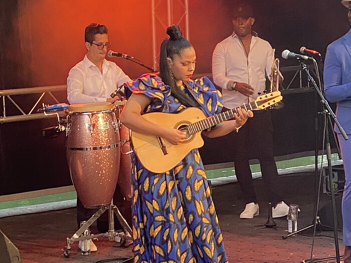 „Yarima Blanco y Son Latino“ präsentierte eigene Songs und kubanische Welthits, inklusive Pause rund zwei Stunden lang. Yarima Blanco zählt als Ausnahmetalent an der dreisaitigen Tres. Dieses Instrument beherrschen nur wenige außerhalb Kubas. Sie holte ein Klangvolumen heraus und eine unglaubliche Dynamik. Den Rhythmus dazu begleiteten ihre Bandkollegen auf Bongos, Trommeln und den typischen kubanischen Rasseln. Kubaner haben den Rhythmus im Blut. Pures Temperament, Lebendigkeit, Lebensgefühl, Liebe zur Musik transportieren sie in ihrem Salsa. Das ließ auch das Wolfratshauser Publikum nicht unberührt. Am Seitenrand der Tribüne tanzten Paare, Könner dieses Stils. Die Stimmung war großartig und der Abend ein absoluter Musikgenuss. Es war ein kleines bisschen Karibik am Loisachstrand.