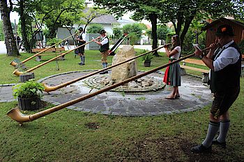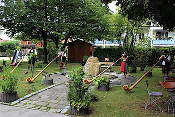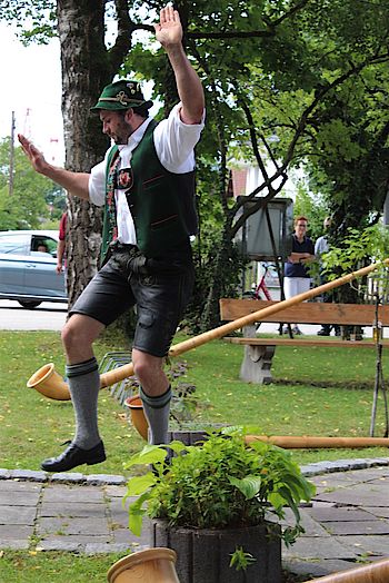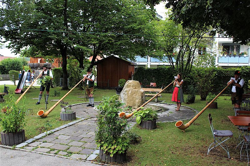 Vor der Kulisse eines plätschernden Brunnens spielten die Alphornbläser etwa eine halbe Stunde lang eingängige Stücke wie „Abendrot", „Am Dorfrand" oder den bekannten „Egerländer Liedermarsch". Zwischendurch gab Michael Wärl eine Schuhplattler-Einlage zum Besten. Als Belohnung brachte der gut gelaunte Wirt der Bläsergruppe ein Tablett mit Bier, Ouzo und Wasser. „Schade, dass wir heute noch ein paar Auftritte haben und nicht länger bleiben können", bedauerte Hubert Kain. Denn das mediterrane Ambiente des Lokals und die Alphornklänge bildeten an diesem Vormittag eine harmonische Einheit. Dabei waren die Töne aus den etwa 3,60 Meter langen Instrumenten nicht nur im Stadtteil Farchet sondern auch im angrenzenden Waldram noch deutlich zu hören: ein würdiger Abschluss der Pop-Up-Konzertreihe.