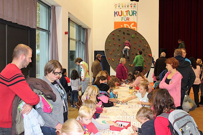 Stadtbüchereileiterin Silke Vogel sowie Marion Klement und Marlene Schretzenmaier vom städtischen Kulturmanagement freuten sich, dass die aus Mitmachaktionen, Unterhaltung und Denksport bestehenden Angebote von Beginn an gut angenommen wurden. Den größten Zuspruch erfuhr zunächst die drehbare Kletterwand, vor der sich schnell eine Schlange ungeduldiger Kinder bildete. Andere zogen vor, an einem der vielen Tische aktiv zu werden. So zeigten die beiden Kräuterpädagoginnen Beate Lutz und Sybille Vogel, wie man aus Pfefferminze, Lemongras und Apfelstücken eine besondere Teemischung herstellt. Ihre Bastel- und Mallust konnten die Kinder am Stand der Klecks-Schule der Phantasie sowie am Tisch von Kathrin Maier ausleben. Die Stadtbücherei lud wie schon im letzten Jahr zum Bücherfalten ein. Ausrangierte Werke wurden dabei zum Beispiel in Herz- oder Christbaumformen umgestaltet.