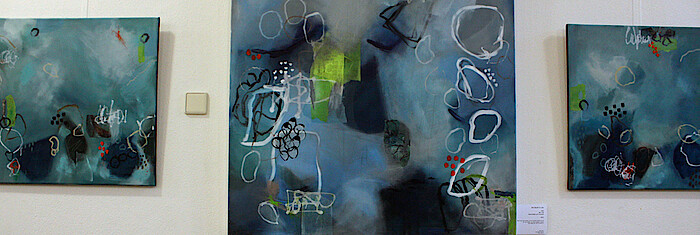 Dietmar Galuschka ist da, wenn der Künstler kommt, um seine Bilder aufzuhängen. Er achtet darauf, dass keines der Bilder schief am Haken hängt und weiß, wo sich die exponierten Plätze befinden. Die aktuelle Ausstellung der 62-jährigen Autodidaktin ist sehenswert. In ihren Bildern zeigt sich, dass Abstraktion nicht gleich Abstraktion ist. Eiber hat einen eigenen Duktus entwickelt, der wie ein künstlerischer Code aus Punkten, Linien, Kringel wirkt. Es sind Farbkompositionen mit höchster Dynamik und Kontrasten. Zum Beispiel sind zwei große Leinwandbilder aus Acryl zu sehen aus unzähligen, kleinteiligen Elementen. Die beiden Bilder sind im Schwerpunkt in Blau und Rot gehalten, entfalten sich in ihrer Gesamtheit jedoch in unzählige Farbnuancen. Es sind Farben, die sich mögen, die gute Laune machen. „Nicht mehr – nicht weniger“, so der passende Titel. Eine Trilogie in Blau fängt den Blick ein. Weiße Kringel tanzen vermeintlich ungeordnet auf der Fläche. „Bitte schauen Sie genau hin, dann sehen Sie, dass sich die Motive ergänzen“, erklärt die Künstlerin. Ist auch das ein Code, der vielleicht ins Unterbewusste führt?