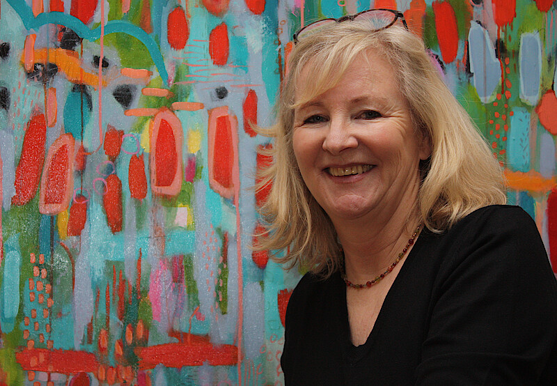Vor zehn Jahren begann die gebürtige Düsseldorferin zu malen, die seit 1994 in München lebt. „Es war eine Zeit hoher beruflicher Belastung“, erinnert sich die gelernte Juristin, die damals als Kongressmanagerin arbeitete. 2017 hängte sie ihren stressigen Beruf an den Nagel und begann zu malen. „Ich schließe die Ateliertüre und bin mit mir allein.“ Ihr Atelier befand sich bisher in einer Garage. Kürzlich hat die Künstlerin ein Atelier im Neu-Perlacher „Shaere“ bezogen. „Farbreich“ nennt sie ihr Atelier. Farbenreich sind ihre Bilder. Sie experimentiert mit Farbschichten. Sie lässt aber auch durch abstrakte Farbkleckse eine angedeutete Form entstehen. Heike Eiber ist Leiterin der Künstlergilde Berg am Laim (München). Außerdem organisiert sie Gemeinschaftsausstellungen und leitet die kleine Galerie lesARTs in Deisenhofen. „Ich finde es fantastisch, dass im öffentlichen Raum, wie hier in einem Gericht, die Möglichkeit besteht, Kunst zu zeigen und sie damit auch Menschen zugänglich zu machen, die nicht ins Museum gehen. Für uns Künstler*innen ein großes Geschenk“, spricht Heike Eiber den Dank an Dietmar Galuschka aus.