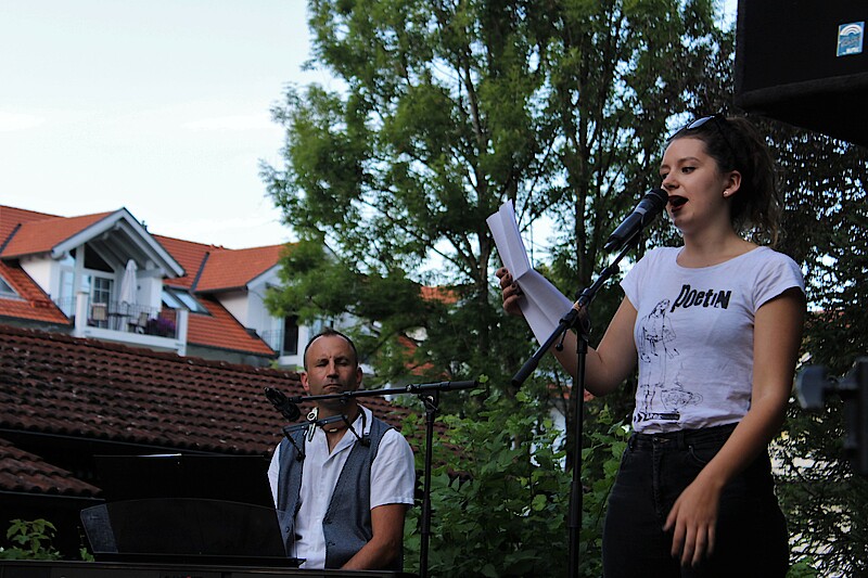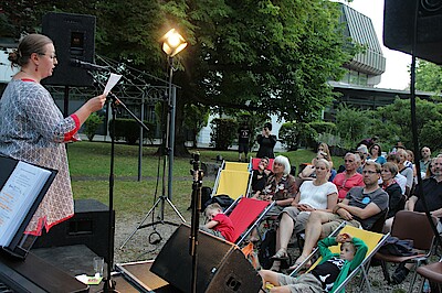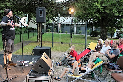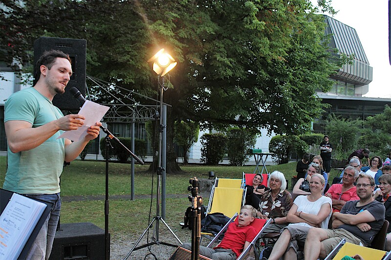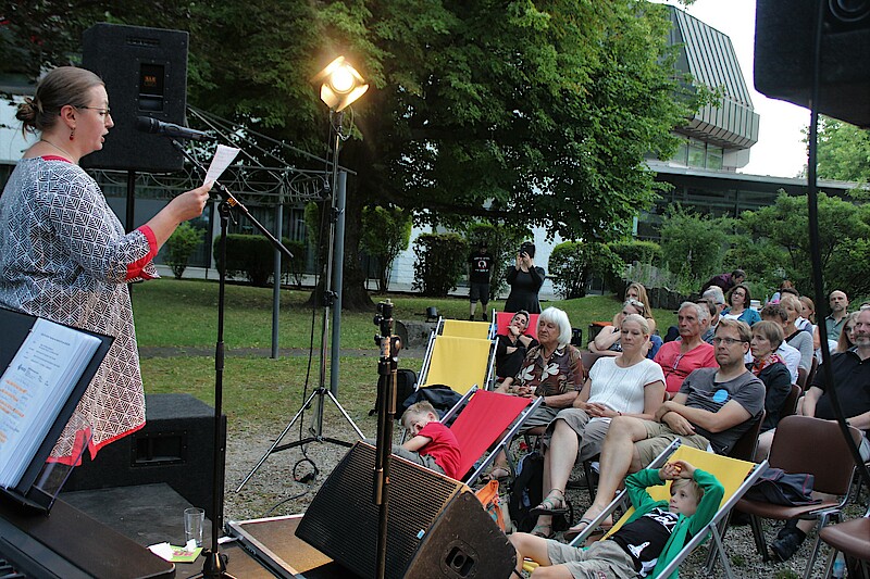Wolfratshausen, 22.7.2022 – Nach dem Kabarett-Auftakt am Bergkramer Hof und dem Michael-Fitz-Konzert im Rathausinnenhof kam es bei der dritten „Kulturpicknick im Grünen“-Veranstaltung im Garten der Stadtbücherei zu einem unterhaltsamen Lesewettbewerb.