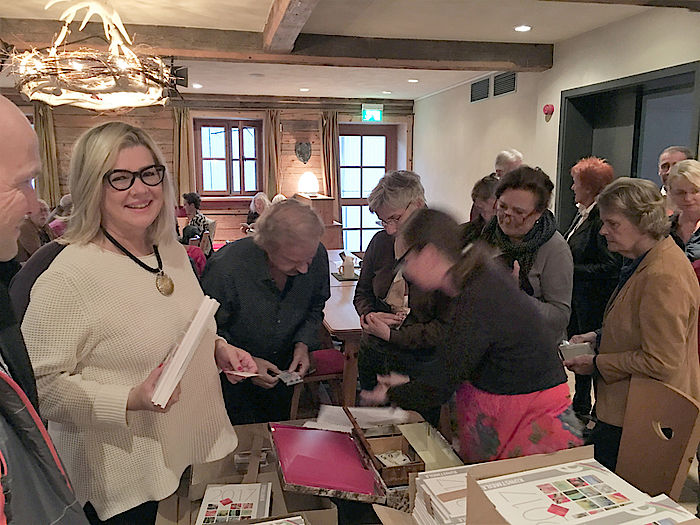 Den Kunstmeilen-Katalog gibt es heuer zum vierten Mal, gestaltet von Werbegrafikerin Astrid Göpfert aus Wolfratshausen. Das neue Layout mag nicht allen Kunstschaffenden gefallen, aber der Groh der anwesenden Künstler war begeistert. Großes Bild des Kunstobjekts, kleineres Porträt des Künstlers und jeweils ein Statement, warum der Künstler das tut, was er tut, überzeugte die Anwesenden. Seit Frühjahr hat Göpfert mit Unterstützung der Kunsthistorikerin Ute Gatzka getüftelt, layoutet und schließlich das fertige Resultat in großer Stückzahl produzieren lassen. „Jede Seite ist eigens auf den Künstler zugeschnitten“, erklärt Göpfert.