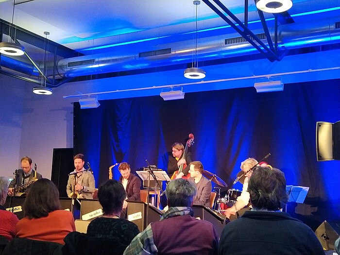 Großartiger Jazz stand im Foyer der Loisachhalle auf dem Programm. Die sieben Musiker von „Grapha“ sorgten als selbsternannte Mini-Bigband für ein außergewöhnliches Musik-Erlebnis. Die Profi-Musiker (drei Saxophone, eine Trompete, eine Posaune, ein Kontrabass und Schlagzeug) aus Österreich und Deutschland sorgten mit vielen überraschenden Einlagen für eine charmante Abendgestaltung. Ob spontane Pfeifeinlagen oder unerwartete Gesangseinlagen, perfekte Soli oder Orgelpfeifen-Mitsingparts für das Publikum oder eine jazzige Hommage an das Thema von „Hubert und/ohne Staller“, Grapha kreierte einen rundum gelungener Abend.