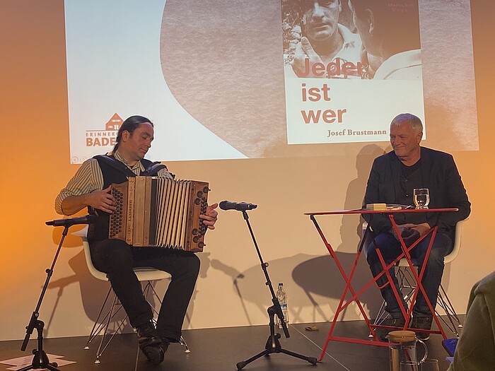 Nach der Buchvorstellung sprach Krafft mit dem Autor über seine persönlichen Erinnerungen an Waldram, wohin seine aus der Heimat vertriebene Familie zufällig strandete. „Schule-Heim-Isar“, so verbrachte der jetzige Ickinger diese glückliche Zeit, wie er erzählte. Später trägt ihn die Musik durchs Leben. Außerdem wurden Filmausschnitte aus einer BR-Dokumentation von Krafft gezeigt, in der sie Josef Brustmann und seine sechs Geschwister vorstellt. Die musikalische Gestaltung übernahmen Martin Regnat (Diatonische) und Brustmann (Gitarre) selbst. Krafft rief die Waldramer Bürger noch dazu auf, auch ihre Erinnerungen und (Familien)-geschichten aufzuschreiben oder Erinnerungsstücke aufzuheben und dem Badehaus zur Verfügung zu stellen.