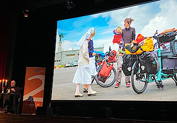 Der Globetrotter André Schumacher präsentierte eine spannende Multimedia-Show „Wildes Europa“. Im Jahr 2013 fuhr Schuhmacher mit seiner Frau Jenni und seinem kleinen Sohn mit Lastenfahrrädern von der norddeutschen Küste über Tschechien, Österreich, Italien, Frankreich nach Pamplona in Spanien, der Heimatstadt seiner Frau. Mit einem Zelt und 10 Kilo Windeln im Gepäck begaben sie sich auf eine atemberaubende Reise. Schumacher beschrieb die Anstrengungen, Herausforderungen und Schönheiten der viermonatigen Tour auf spannende und humorvolle Weise. „Tschechien hat uns umgehauen. Bier, Land und Leute“, so beschrieb er im Detail die südböhmische Stadt Krumlov, Weltkulturerbe, die in einer Meanderschleife der Moldau liegt. Es gab auch Situationen die grenzwertig wurden, „wo man dem Partner vermitteln muss, dass das, was man tut, schön ist“. Zum Beispiel die schweißtreibende Auffahrt der Großklocknerstraße und dann der eisige Schneesturm auf dem Gipfel. Versöhnt haben die Momente, wenn die Sonne über den Alpengipfeln untergeht oder das tiefe Violettblau der Lavendelfelder in der Provence in der Sonne leuchtet, der süße Duft der weltbesten Melonen in Frankreich und die Zielfahrt in die Kleinstadt Pamplona beim traditionellen Straßenfest der großen Puppen.