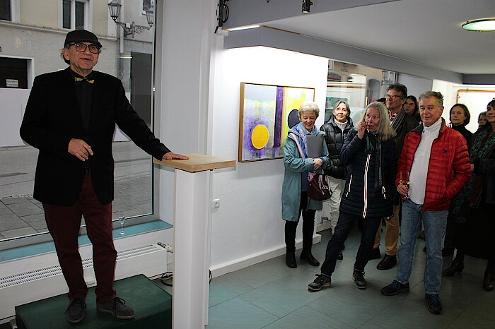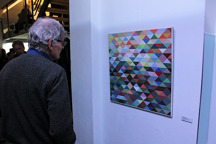 In weiteren kurzen Ansprachen stellten sich einige der ausstellenden Künstler vor. Dabei wurde deutlich, dass viele von ihnen weite Anfahrten auf sich nahmen und auch Übernachtungen in Wolfratshausen gebucht hatten. So reiste beispielsweise Elvira Lantenhammer aus Homburg am Main an, um Werke ihres „Color Siteplans“ zu zeigen. Die Malerin, die auch in europäischen Metropolen wie Athen und Paris künstlerisch tätig ist, lobte die drei neuen Wolfratshauser Kunstturm-Betreiber. „Das ist eine tolle Initiative, die Hochachtung verdient“, schwärmte Lantenhammer. Ähnlich äußerte sich Stefan Konrad, der in seinen Werken geometrische Strukturen mit Naturmotiven verbindet. „Ich bin gerne quer durch Bayern gefahren, um hier ausstellen zu können“, erklärte er.