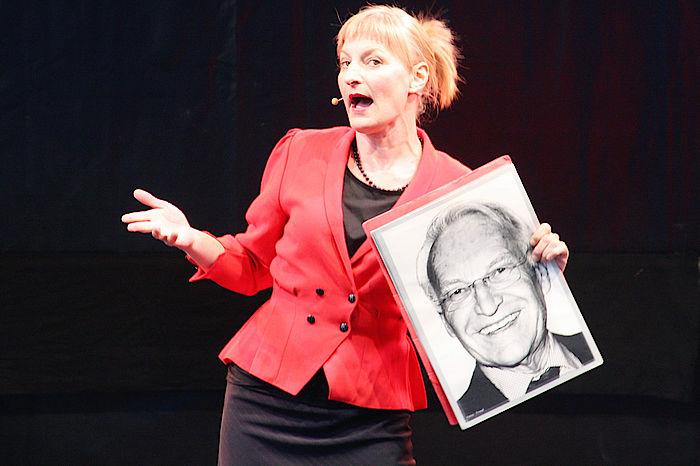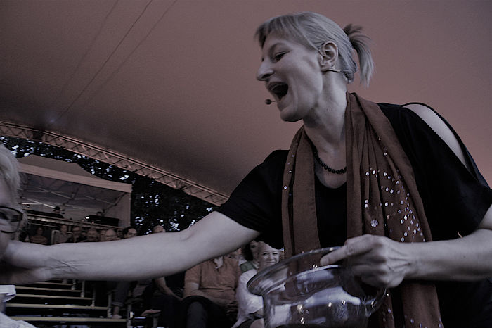 Ein bisschen Politik-Stichelei muss sein und viel Kleinbürgertum, das seinerzeit schon Karl Valentin aufs Korn nahm oder besser gesagt, verbrettelte. Darauf gab es ein „Glasl Eigenurin vom Morgenstrahl“ von Bianca Bachmann fürs Publikum. Pause!