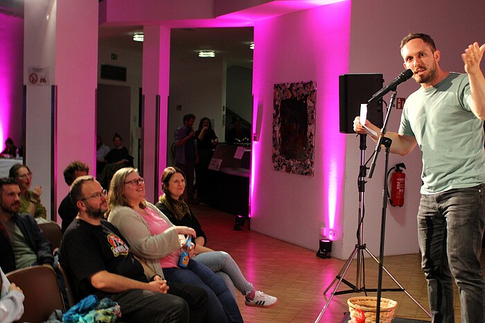 Ursprünglich war eine Austragung im Garten der benachbarten Stadtbücherei geplant. Die unsicheren Wettervorhersagen bewegten Katharina Roßkopf und Andreas Kutter vom Kulturamt jedoch zu einer Verlegung. Nach der musikalischen Einleitung des Gitarristen Alexander Oberrader erklärte Moderator Kutter im Eiltempo die Spielregeln. Wie bei den vorherigen Wettbewerben durften die Slammer nur selbstverfasste Werke in einem siebenminütigen Zeitlimit vortragen. Requisiten, Kostüme, Musikinstrumente oder Hilfsmittel waren untersagt.