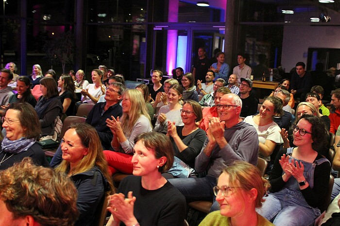 Im Showdown hatten die rund 100 Besucher dann die Qual der Wahl: Denn Frank Klötgen, Max Osswald und Ines Strohmaier lieferten beste Unterhaltung. Die im österreichischen Kleinwalsertal aufgewachsene und mittlerweile in Bern lebende Autorin präsentierte überraschenderweise einen weihnachtlichen Text zu einem kuriosen Familientreffen in ihrer Heimat. Klötgen huldigte dem in einem Orchester oft übersehenen, aber umso wichtigeren Paukisten. Die meisten Lacher und damit auch den Sieg sicherte sich jedoch Max Osswald. Der 31-Jährige eroberte mit seinen selbstironischen Alltagsbeobachtungen von vorgewärmten U-Bahn-Sitzen und Nahtoderfahrungen als Radfahrer im Großstadtverkehr die Herzen der Zuhörer.