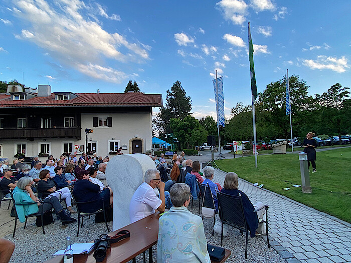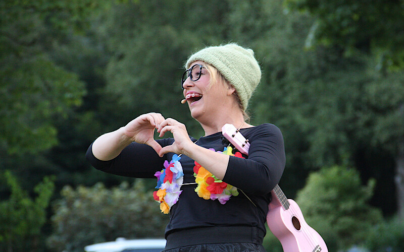 Wolfratshausen, 18.7.2022 – Eigentlich war der Auftritt der Kabarettistin Constanze Lindner für die Bergwaldbühne geplant. Nachdem aber die Entscheidung gefallen war, die Bühne nicht in den Veranstaltungsbetrieb zu nehmen, trat die mit dem Bayerischen Kabarettpreis gekrönte Münchnerin im Rahmen der Reihe „Kulturpicknick im Grünen“ auf dem Gelände des Bergkramerhofs auf, zwischen Golfclub und Café Herzblut. Ein Sommerabend, unvergessen, schrill, schrullig über Missen und Möpse.