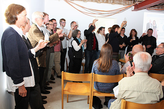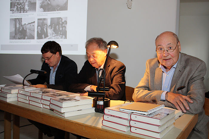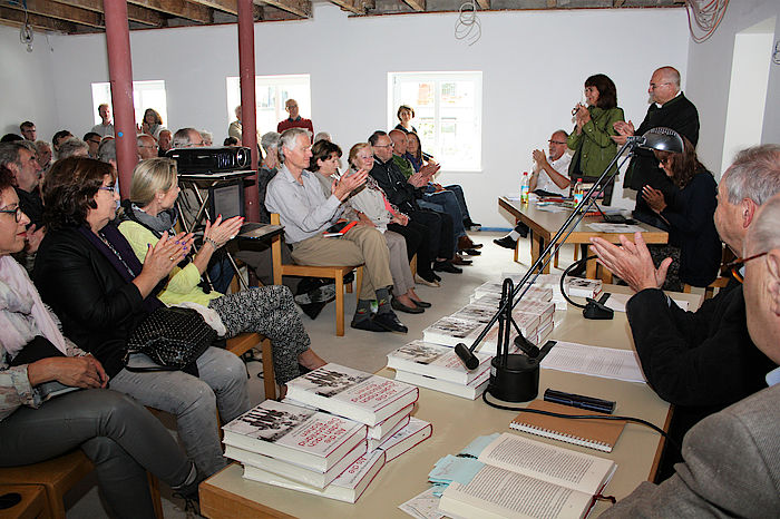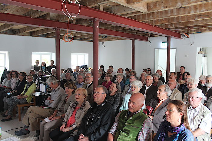 Über 100 Gäste – unter ihnen auch der Wolfratshauser Vize-Bürgermeister Fritz Schnaller und der Geretsrieder Bürgermeister Michael Müller – drängten in den fast überfüllten Raum. Bevor Zeitzeuge Robbi Waks sowie die beiden Autoren Hans-Peter Föhrding und Dr. Heinz Verfürth das Buch „Als die Juden nach Deutschland flohen“ vorstellten, blickten die Badehaus-Vorsitzenden Dr. Sybille Krafft und Wolfgang Saal auf ein arbeitsreiches Jahr zurück. Demnach leisteten die derzeit 337 Mitglieder allein im vergangenen Jahr 3086 ehrenamtliche Stunden. Zudem wurde die Finanzierung des geplanten Dokumentations- und Begegnungszentrums nach einem wahren „Antrags-Marathon“ aus verschiedenen Fördertöpfen sichergestellt. „Allein an der Baustelle haben im letzten Jahr 45 Männer und Frauen zusammen über 2000 Stunden gearbeitet“, berichtete Saal. Während die Sanierungsarbeiten auch dank der Mithilfe von verschiedenen Schulen weit fortgeschritten sind, sichtet und beschriftet die Dokumentationsgruppe immer noch fleißig Material. „Sie erstellen ein inhaltliches Konzept für die einzelnen Räume“, erklärte Krafft. Auf die Frage eines Mitglieds, wann die Dokumentationsstätte eröffnet werden könne, räumte Wolfgang Saal einen leichten Verzug ein. „Es wird wohl nicht wie anfangs geplant im Frühjahr 2018 sondern ein paar Monate später so weit sein“.