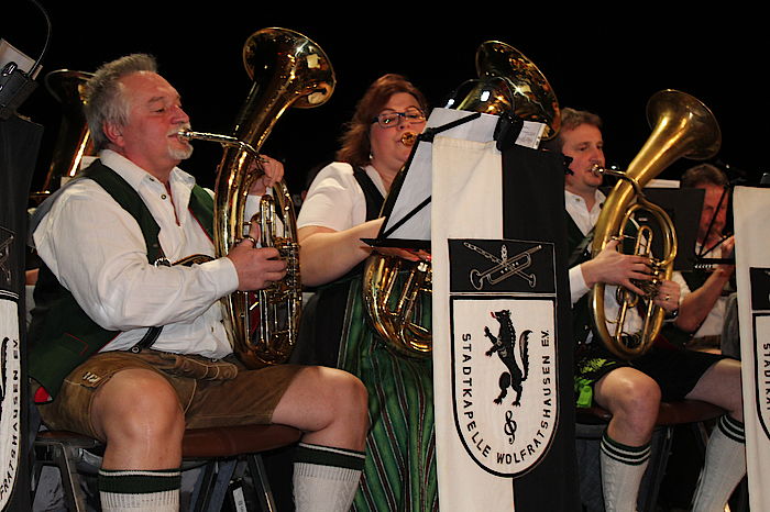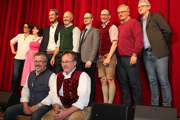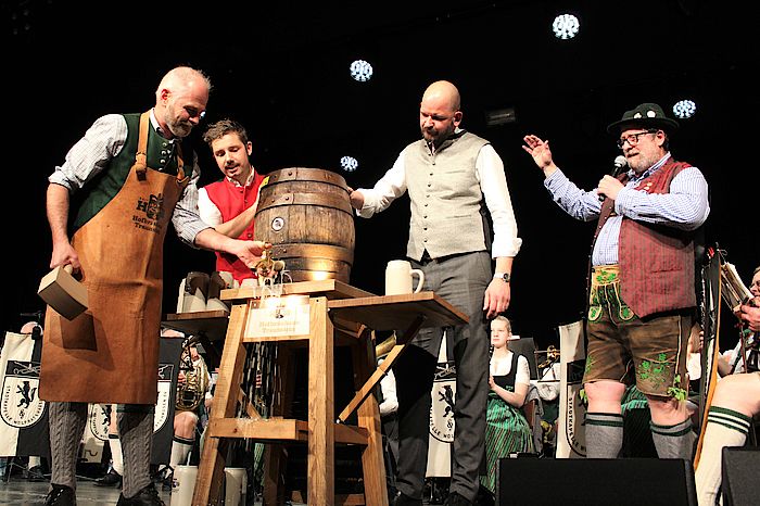 Wolfratshausen, 2.3.2020 – Vier Schläge benötigte Bürgermeister Klaus Heilinglechner, um am Freitagabend das Starkbierfass in der ausverkauften Loisachhalle anzuzapfen. Danach wurden er und vier weitere Bürgermeisterkandidaten im Singspiel der Loisachtaler Bauernbühne derbleckt. Für die passende Musik sorgten die Stadtkapelle Wolfratshausen und die Oktoberfestband Bergluft.