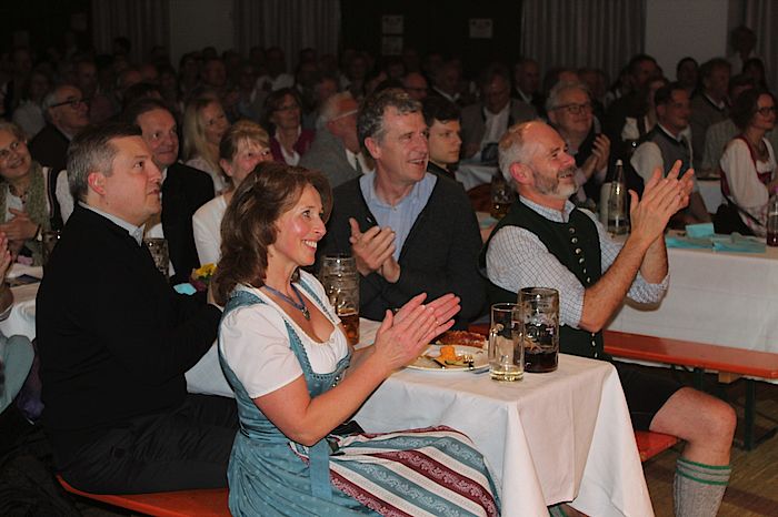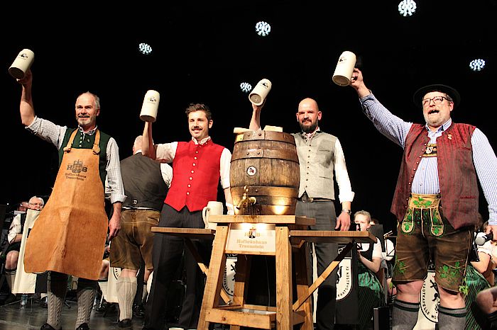 Bevor Klaus Heilinglechner sich die Lederschürze umband und zum Hammer griff, versicherte Hofbräuhaus-Traunstein-Geschäftsführer Maximilian Sailer, dass der Fastenbock das beste Mittel gegen den derzeit grassieren Corona-Virus sei. Moderator Ludwig Gollwitzer gab ihm Recht: „Das Starkbier sieht schon aus wie Hustensaft. Das muss helfen“, empfahl er eine Schluckimpfung. Heilinglechner zapfte das Fass schließlich mit vier Schlägen an. Begleitet von der Blasmusik der Stadtkapelle Wolfratshausen ließen sich die rund 600 Besucher in der ausverkauften Loisachhalle dann zunächst das Bier und deftige Gerichte wie beispielsweise Ochsen- oder Schweinebraten schmecken. Gespannt warteten sie auf das unter der Regie von Monika Schwenger und Susanne Vorderwülbecke entstandene Singspiel „Wahl ohne Grenzen“.
