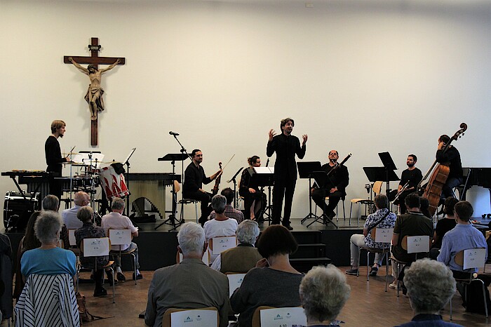 Dirigent Daniel Grossmann ließ es sich nicht nehmen, die Entstehungsgeschichte der beiden dargebotenen Kompositionen ausführlich zu erklären. So ist die von Erwin Schulhoff (1894 – 1942) verfasste „Suite für Kammerorchester“ von den musikalischen Einflüssen der 1920er-Jahre geprägt. Das Waldramer Publikum bekam hier einen erfrischenden Stilmix aus Jazz, Ragtime, Tango und Step zu hören. Wesentlich beklemmender wirkte das anschließende Melodram „Die Weise von Liebe und Tod des Cornets Christoph Rilke“. Viktor Ullmann schrieb es einst im Konzentrationslager Theresienstadt. Es war seine letzte Komposition, die der österreichisch-ungarische Komponist vor seiner Ermordung 1944 fertigstellen konnte.