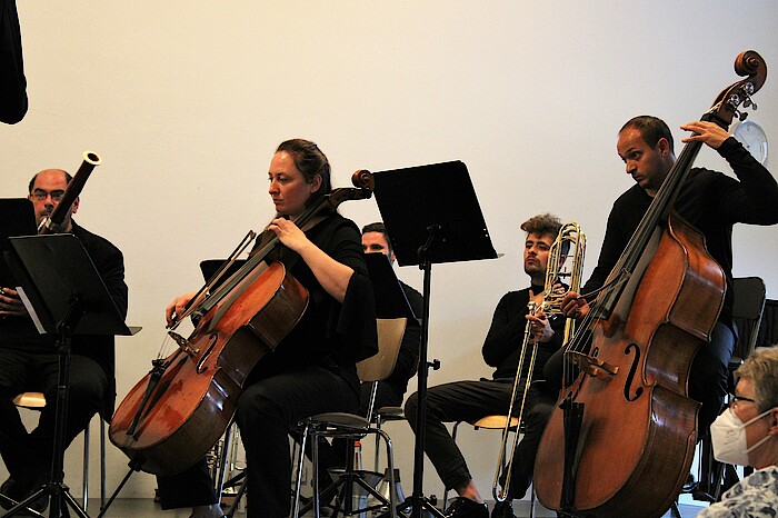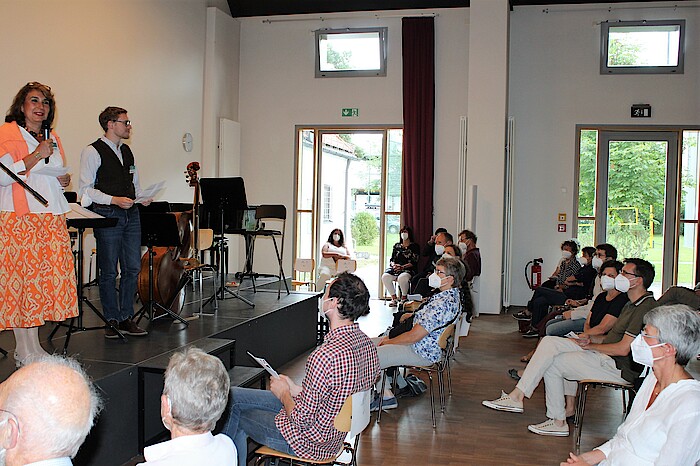 Der 24-jährige Valentin Mirow rezitierte dazu Textausschnitte aus einer Erzählung von Rainer Maria Rilke, die sich um die Erlebnisse eines jungen Fahnenträgers während des Türkenkriegs im 17. Jahrhundert drehen. „Sie reiten über einen erschlagenen Bauern, später heulen Hunde“, hieß es an einer Stelle. Trotz der hervorragenden musikalischen Darbietung des Orchesters war das ein zweifellos schwer verdauliches Hörerlebnis. Deshalb luden Dr. Sybille Krafft und die rührigen Vereinsmitglieder des Badehaus-Vereins die Konzertbesucher im Anschluss zu einem Empfang und Führungen durch den Erinnerungsort am Kolpingplatz ein. Für das Jewish Chamber Orchestra Munich gab es als Dankeschön Mahnblumen.