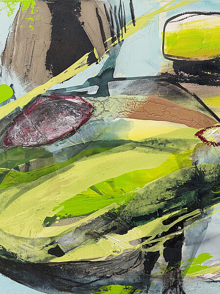 Schicht um Schicht baut die gebürtige Frankfurterin ihre Bilder auf. Dabei spielen Bitumen, sprich der zähflüssige Asphalt, Sumpfkalke und Steinmehle eine besondere Rolle. Sie geben den Acrylfarben eine haptische Struktur. Es entstehen Kerben, Risse, Erhebungen in die wiederum die Farben eindringen und sich optisch verändern. Durch diese Materialien entstehen nach der Trocknung oftmals ganz überraschende Effekte. Wer sich mit Abstraktion auseinandersetzt, weiß, wie schwierig es ist, zu wissen, wann man mit dem Malen aufzuhören hat. „Ich muss mich immer bremsen, um nicht zu detailreich zu werden“, sagt die 65-jährige Künstlerin. Sie beginnt intuitiv und überlässt die Entwicklung dem Zufall bis ein „besonderes Gefühl von Balance und Frieden“ in ihr aufkommt. Diese Balance bildet auch die Farbharmonie und Spannung, die der Betrachter bei den Arbeiten von Linda Jatho-Hölzl empfindet.