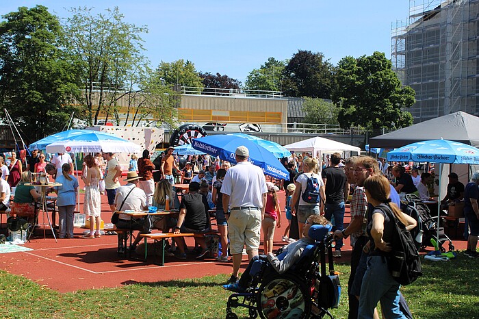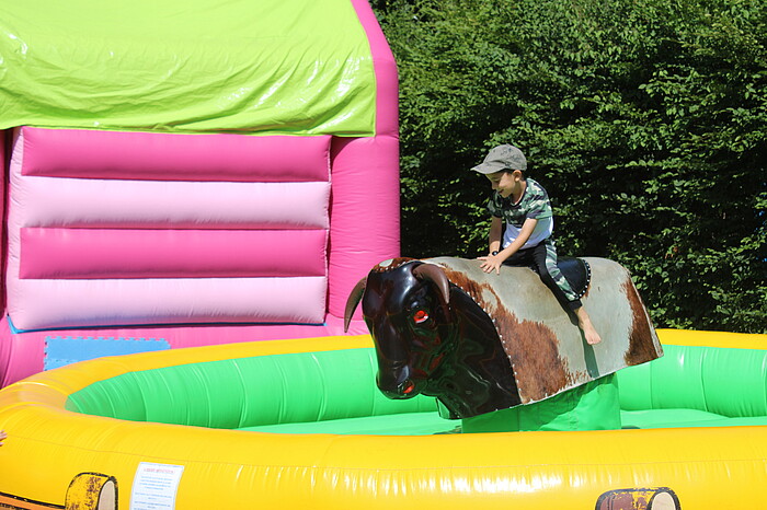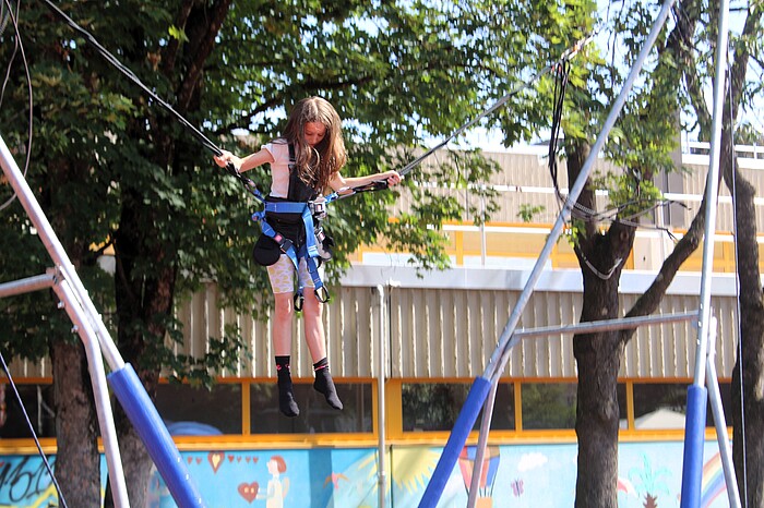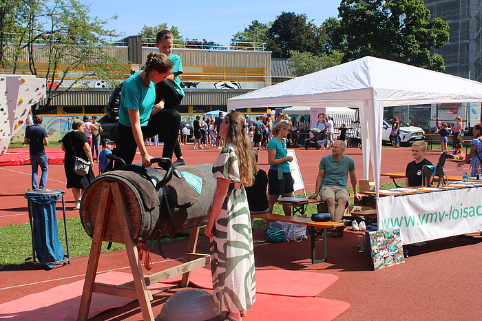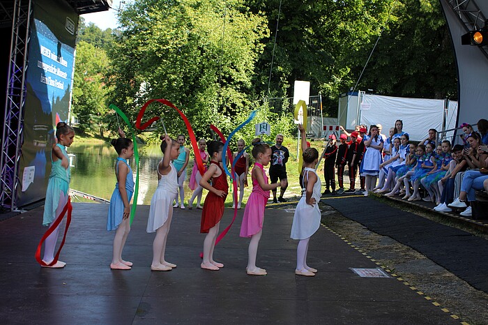Als Moderator Ludwig Gollwitzer im Stile eines Zirkusdirektors mit Zylinder und rotem Frack am Vormittag die erste Show von Dominik Halameks Dance Factory ankündigte, war die Fluss-Festival-Tribüne bereits vollbesetzt. Während die Balletttänzerinnen eine heiße Sohle aufs Parkett legten, surften die Jungs gegenüber auf dem Sportplatz mit kleinen Brettern über eine künstlich angelegte Wasserbahn. Andere kamen beim Bull-Riding oder auf dem Bungee-Trampolin gehörig ins Schwitzen. Da war es hilfreich, dass Jugendliche hinterm La Vida kühle Getränke zu familienfreundlichen Preisen verkauften. Während es bei den Wasser- und Limonadenvorräten zu keinen Engpässen kam, waren einige Speisen bereits zur Mittagszeit vergriffen. „Die 300 Hot Dogs waren schon gegen 12 Uhr aus“, staunte KJFV-Geschäftsführer Fritz Meixner. Deutlich besinnlicher gestaltete sich das Klangbaden im Garten der Stadtbücherei: Die leisen Töne der Metallschalen luden vor allem Väter und Mütter zum Entspannen ein. Ein besonderes Erlebnis versprach ein Fahrsimulator der S-Bahn. Zu Zugausfällen oder lästigen Verspätungen wie bei der S7 kam es nicht. „Wir sind hier immer pünktlich“, versprach Triebfahrzeugführer Benjamin Heigl.