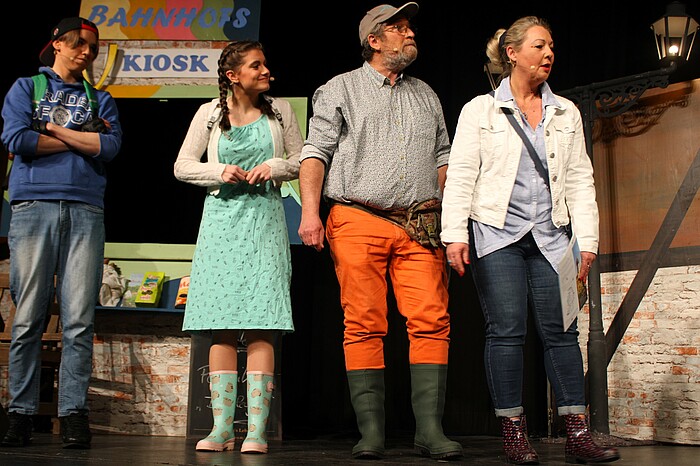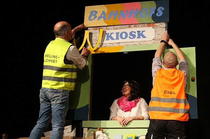 Unter dem Motto „Wolfratshausen – mächtig am Zug“ zeigte das Bühnenbild zunächst die Tristesse des vom Leerstand geprägten Bahnhofs. „Herrschaftszeiten – wo’sd hinschaust – a einzige Baustelle. Ob jetzt da an dem maroden Bahnhof oder in der Altstadt“, haderte Vize-Bürgermeister Günther Eibl (Tom Janoschi). Ratshauschef Klaus Heilinglechner (Andreas Wastian) wunderte sich derweil, dass Dritte Bürgermeisterin Annette Heinloth (Eva Zinnecker) im Bahnhofskiosk Fairtrade-Produkte und Cannabis verkauft. Kritik hagelte es zudem für das Transformationslabor von Stadtmanager Dr. Stefan Werner (Stefan Randi) und die „Dreifachbremser“ der Wolfratshauser Liste. Eine Touristenfamilie (Ludwig Gollwitzer, Sylvia Demmel, Lenny Lisy und Sophia Brauner), die von den Spatzenrikscha-Zwillingen Sarah und Leonie Brand durch die Publikumsreihen gefahren wird, betritt in Gummistiefeln die Bühne. In Anspielung auf den neuen Werbeslogan „Mächtig im Fluss“ wollten sie sich nicht gleich beim ersten Besuch in der Flößerstadt nasse Füße holen.