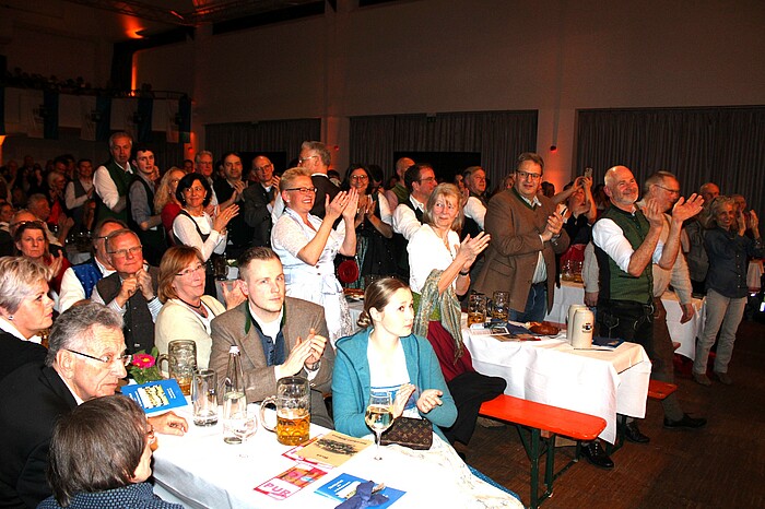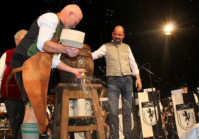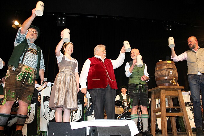 Wolfratshausen, 4.3.2024 – Drei Schläge benötigte Bürgermeister Klaus Heilinglechner, um am Freitagabend das Bierfass in der ausverkauften Loisachhalle anzuzapfen. Danach lachten die 588 Besucher über das Singspiel der Loisachtaler Bauernbühne und tanzten zur Musik der Oktoberfestband Nachtstark.