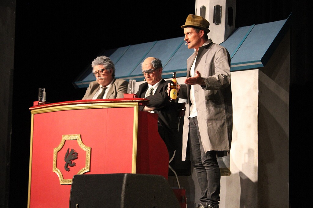 Währenddessen präsentierte Dr. Patrick Lechner (Tobias Zengerle) gemeinsam mit Umweltreferent Dr. Hans Schmidt (Markus Auer) kreative Lösungen zur Haushaltskonsolidierung – etwa mithilfe eines Solarrads, das grüne Leuchtkraft in der Marktstraße erzeugt.