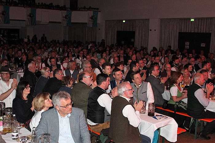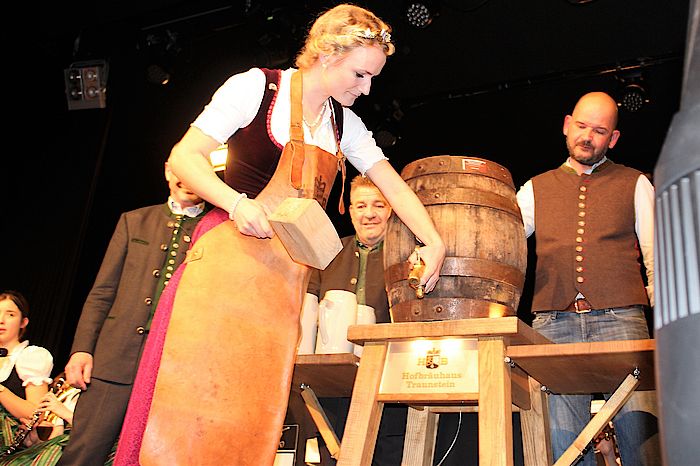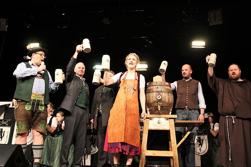 Wolfratshausen, 25.3.2019 – Die bayerische Bierkönigin Johanna Seiler zapfte in der ausverkauften Loisachhalle mit vier Schlägen das erste Starkbierfass an. Neben den musikalischen Beiträgen der Wolfratshauser Stadtkapelle und der Münchner Zwietracht galt das Interesse der Besucher vor allem dem Singspiel der Loisachtaler Bauernbühne.