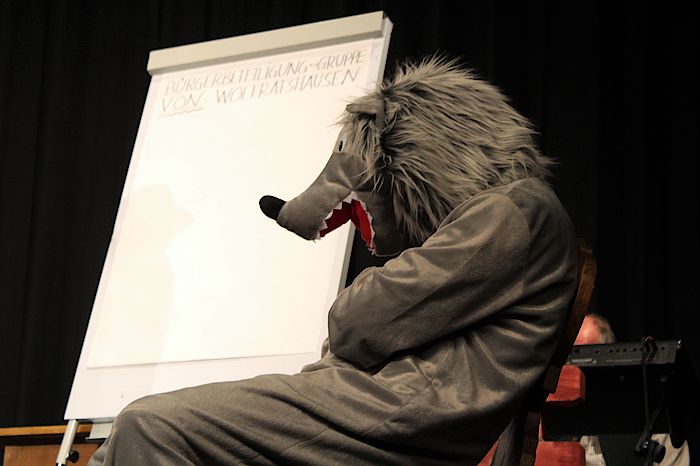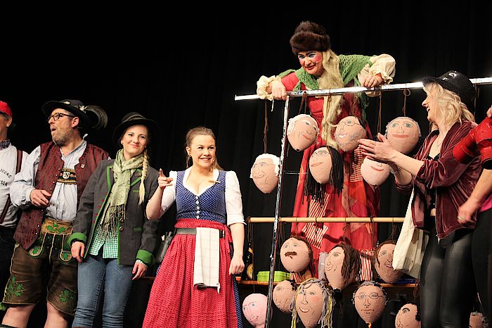 Im zweiten Akt nimmt das Singspiel den Wolfratshauser Bürgerbeteiligungsprozess auf die Schippe. „De Stadträt wern sie nur einigen auf den kleinsten gemeinsamen Nenner – ois andere wird was für den Ofenbrenner“, prognostiziert das Marktgschlerf. Da könne auch ein Geretsrieder Motivator im Wolfspelz (Tom Janoschi) nicht mehr viel ausrichten. „Der kummt von dort, wo ma den Begriff Ewigkeit mit dem Begriff S-Bahn-Verlängerung gleichsetzt“, frotzelt Hermann Paetzmann. Im letzten Akt thematisieren viel beschäftigte Bauarbeiter die stetige Nachverdichtung und die hohen Immobilienpreise. „In unsrer Wolfratshauser Mini-Stodt bebauns a jedes Fitzerl“, jammert Willi (Chris Foitzik). Schorsch (Florian Roth) zieht ein ernüchterndes Fazit: „De Wolfratshausa san wia de Geretsrieder: genauso größenwahnsinnig. Aba halt nur im Kleinen“. Fast folgerichtig werden die im Rathaus sitzenden Stadträte mit einem Strahler versehentlich in Schrumpfköpfe verwandelt. Ein Blick ins Publikum beruhigte die Darsteller: „Schaugts doch obe! Da hocken’s doch alle in da Reih – und so „großkopfert“ wie oiwei!“, seufzte das Marktgschlerf. Als Krönung überreichten die Schauspieler die Köpfe an die Stadräte.