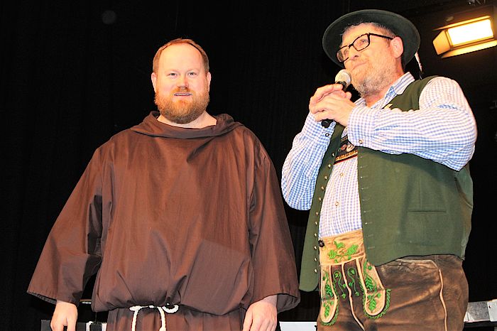 Moderator Ludwig Gollwitzer begrüßte Bruder Barnabas (Ludwig Schmid) aus der Nachbarstadt Geretsried. Einen längeren gemeinsamen Auftritt mit Gollwitzer wird es beim „interkommunalen Derblecken“ am 11. Mai geben.