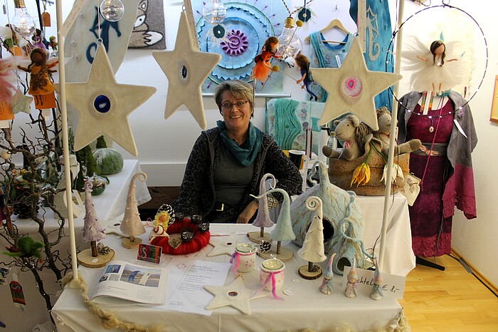 Susanne Wohlrab verkaufte ihre lieblichen Filzdinge. Über großes Interesse freuten sich auch die anderen der derzeit gleichzeitig ausstellenden Künstler und Künstlerinnen. „Die Symbiose von Kunst und Handwerk ist schon etwas Besonderes. Warum stellen bildende Künstler in Galerien aus und hervorragende Kunsthandwerker in Marktbuden? Wir stellen Kunst und Handwerk auf eine Augenhöhe", hob Andrea Weber in ihrer Begrüßungsansprache hervor. Die Vielfalt reichte von gedrechselten Flaschenöffnern für den kleinen Geldbeutel bis hin zum 10.000 Euro teuren Gemälde.