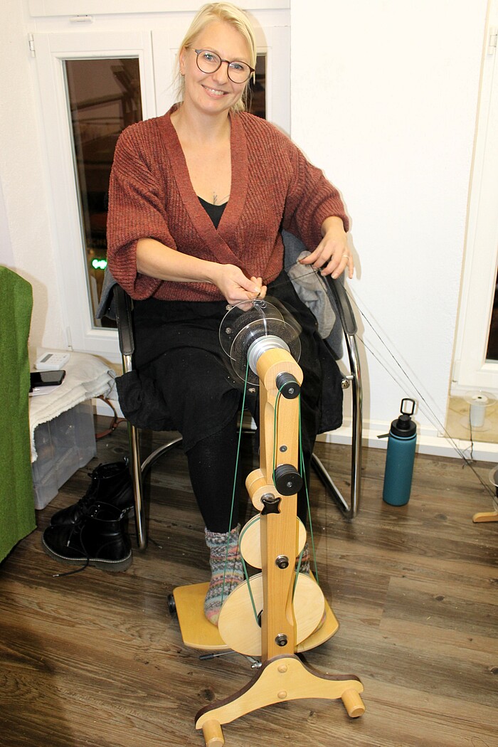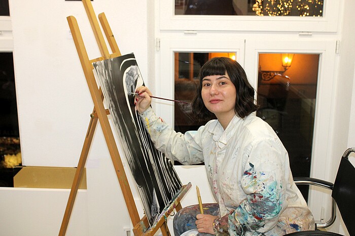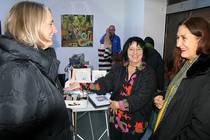 Ausstellungs-Initiatorin Andrea Weber sowie die Kunstturmbetreiber Hans-Werner Kuhlmann und John Schille bereiteten den Gästen der Vernissage einen herzlichen Empfang. Wer wollte, konnte bei einer Tasse Glühwein oder einem Glas Prosecco und kleinen Häppchen die auf drei Etagen verteilten Stände bewundern. So malte die Münchner Illustratorin Eleni Garmhausen ihre Tuschebilder live vor Ort. Direkt gegenüber drehte sich bei „Erlenwald Lamas“ das Spinnrad auf Hochtouren. Zwischendurch ließ Dr. Csilla Hoffmüller ihre Keramikwerke leuchten und