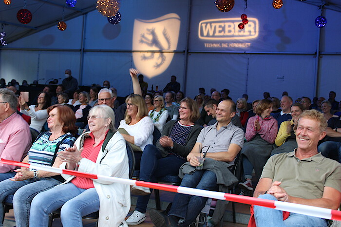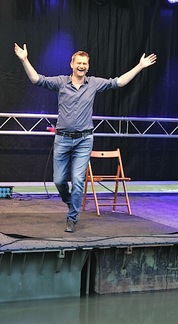 Im Stile eines selbstbewussten Entertainers betrat Michael Altinger die Flussfestivalbühne und badete erstmal zwei Minuten im donnernden Begrüßungsapplaus des Publikums. „Ich genieße das wie eine Dusche“, erklärte Altinger. Wie vielen anderen Künstlern blieben ihm Live-Auftritte pandemiebedingt lange versagt. Durch die Mitwirkung an kabarettistischen Sendungen im Bayerischen Fernsehen, das Schreiben eines Buches sowie einer CD-Aufnahme überbrückte er die Krise. Altingers aktuelles Programm „Schlaglicht“ entstand bereits 2019 als zweiter Teil einer Trilogie mit ständig wiederkehrenden Darstellern und Rollenspielen. So erwartet er beispielsweise seinen Freund Helmut Lux auf einer imaginären Grillparty, die er durch die eingespielten Geräusche einer sich ständig öffnenden Tür und das Quietschen eines Kühlschranks darstellt. „I blas selber in den Grill – kein Fön, kein Blasebalg: Das verschafft mir ein analoges Gefühl“, behauptet Altinger. Als „Flexitarier" esse er selten Fleisch und grille nur böse Tiere.