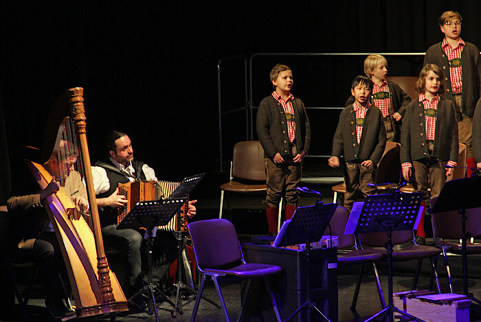 Zeitgleich wurde die Geschichte auf zwei großen Leinwänden wie eine Live-Monitoring-Zeichnung in stilisierten Schwarz-Weiß-Bildern dargestellt. Soviel zum Rahmen. Zur Musik gibt es nur auf den Punkt gesagt: die jungen Chorsänger sowie das Erwachsenen-Orchester und die Solisten – ein Harfinist und der im Landkreis bekannte Musiker Martin Regnat am Akkordeon – präsentierten einen musikalischen Weihnachtsabend mit dem Flair einer verschneiten Winternacht im Alpenland. Die Chorknaben standesgemäß in Janker und in der Lederhose sorgten mit ihren glockenklaren Stimmen für Begeisterung. Die Solisten sangen, quasi wie Engel im Himmel. Beim Tölzer Knabenchor dürfen nur junge Sänger vor dem Stimmbruch mitwirken. Carl Orffs Weihnachtsgeschichte beginnt mit leiser Flötenmusik. „San d’Schof scho drin im Stall?“ fragten sich die drei Hirten und machten sich auf den Weg, um dem Licht in der sternenklaren Nacht zu folgen.