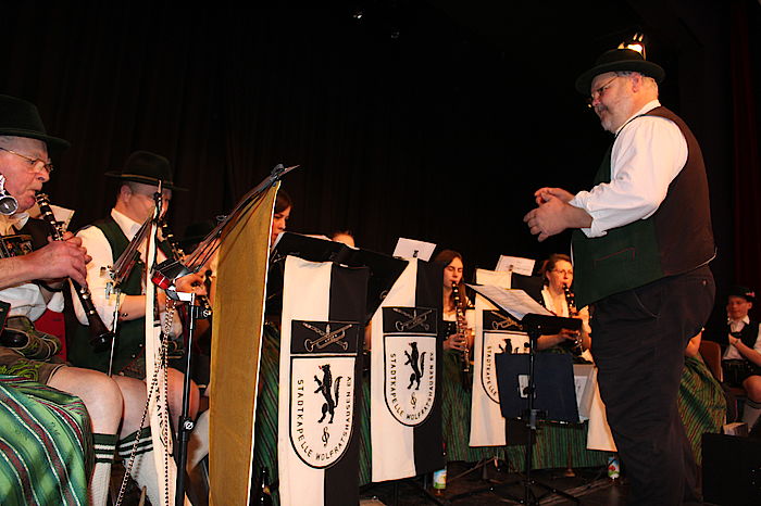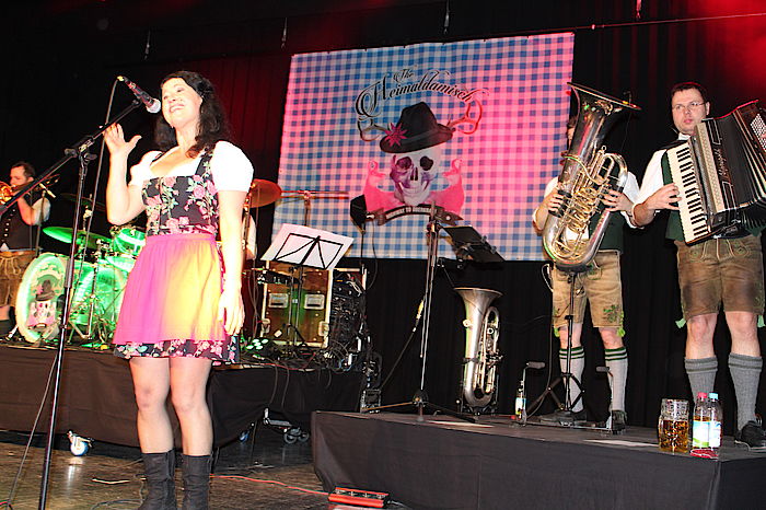 z. B. „Alles nur geklaut“ oder „So ein schöner Tag“. Die Musik entstand in Zusammenarbeit von Eveline und Gerd Hörschelmann sowie Edmund Hofmann. Danach gehörte die Bühne der Band The Heimatdamisch. Sängerin Conny Kreitmeier, Schlagzeuger Florian Rein und weitere sechs Bandmitglieder brachten das Publikum mit der rockigen Oberkrainer-Interpretation von bekannten Hits bis Mitternacht zum Tanzen. Da feierte auch die Wolfratshauser Stadtkapelle mit, die den langen Starkbierabend eröffnet hatte.