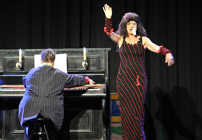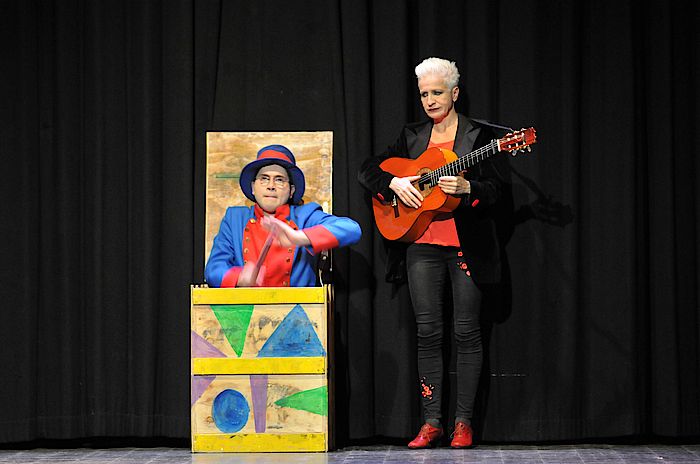 Auch Masha und Nina begeisterten, etwa als Masha auf einem durchhängenden Seil – ja, hier passt das Wort wirklich – tanzte, zudem auf dem Rücken liegend einen Sonnenschirm mit Füßen und Armen durch die Luft wirbelte oder mit Bändern zauberte. Den musikalischen Rahmen für das zirzensische, vielgestaltige Feuerwerk schaffte die musikalische und stimmgewaltige Nina: mal an dem Charango, einem bolivianischen Zupfinstrument, mal an der Gitarre, oder aber eben auch mit der Stimme. Auch hier gingen höchste Kunst und Komik Hand in Hand, etwa in ihrer fulminanten Interpretation von „Oh Donna Clara“. Der gemeinsame, zunehmend furiose Gesangsauftritt mit Silvana am Klavier fand schließlich das zu erwartende blamable Ende – erst mit der Entblößung des Preisschildes der wallenden Perücke und schließlich gar mit deren kompletten Verlust, was die Sängerin flugs davoneilen ließ.