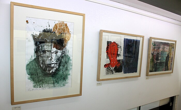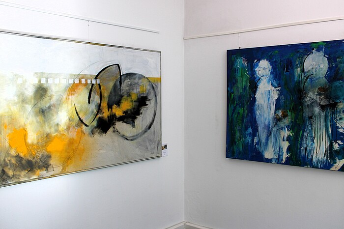 Die Musik der beiden Komponisten Benjamin Britten und Gustav Mahler inspirierten den Österreicher Siegfried Antonello Schwendtner. Seine großformatigen Bilder erscheinen wie ein abstrakter Farbenrausch. Wegen einer bronchialen Erkrankung konnte sich Walter Franzen nicht zu seinem künstlerischen Ansatz äußern. Der 84-Jährige begann erst Anfang der 1990er-Jahre als Autodidakt mit der Erstellung von Aquarellen und ging später zu abstrakter Mischtechnik über. Dabei trägt Franzen die Farben entweder klassisch mit Pinsel und Spachtel oder mit Bürsten und seinen Fingern auf. In Kombination mit Bestandteilen wie Holz, Bitumen und Stoffresten entstanden überraschende Werke,die die ersten Ausstellungsbesucher in ihren Bann zogen.