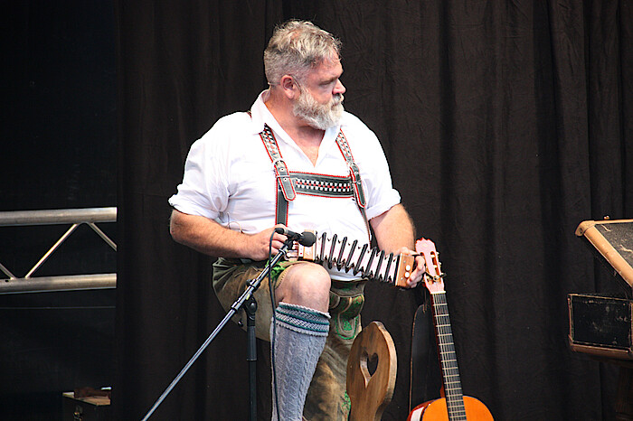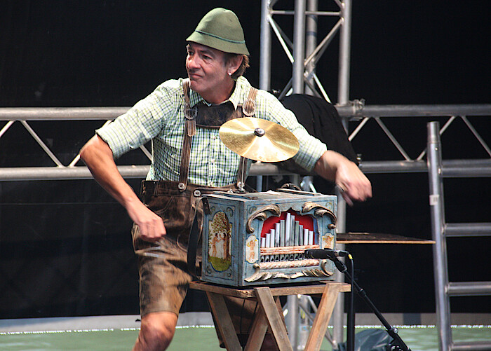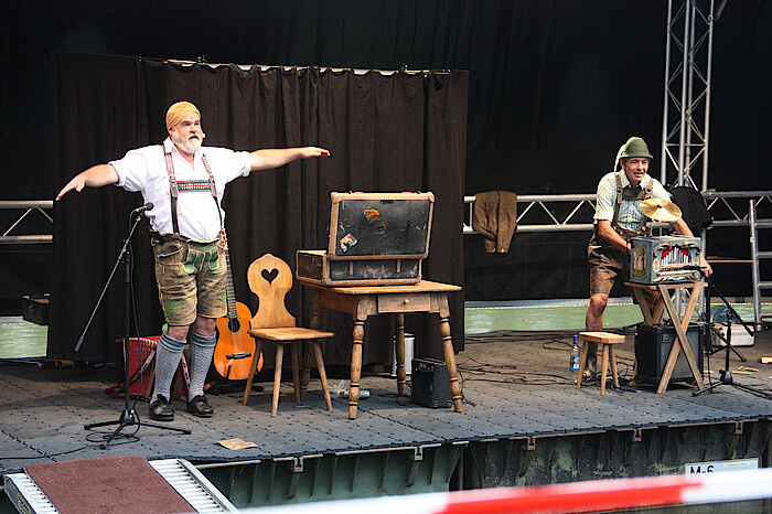 Wolfratshausen, 19.7-2021 – Luggi und Guggi, das sind zwei lustige Komödianten aus dem Werdenfelser Land. Sie unterhielten auf dem Flussfestival in Wolfratshausen das Publikum mit Slapstick, Zauberei und schrägen Volksmusik-Tönen aus der Luftpumpe, dem Leierkasten und dem Staubsauger. Beim Publikum kamen die beiden Typen in Tracht, die sich selbst als „Dick und Dünn“ bezeichnen, unterschiedlich an. Die einen klopften sich auf die Schenkel, die anderen betonten höflich, dass dies eine Geschmacksache sei.